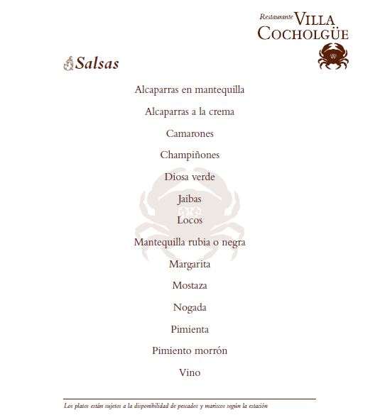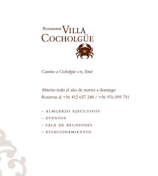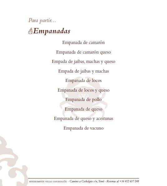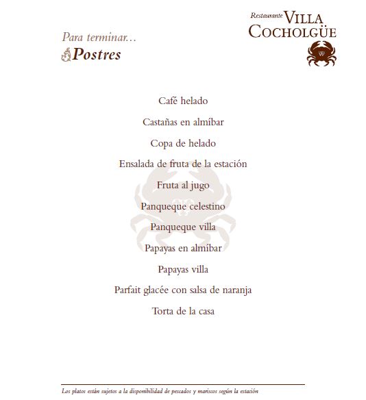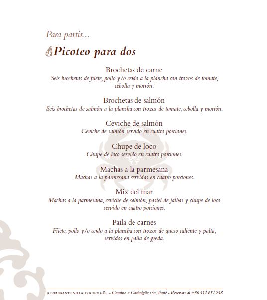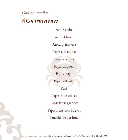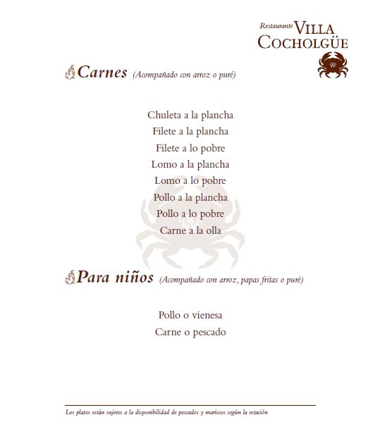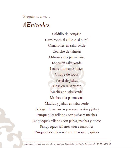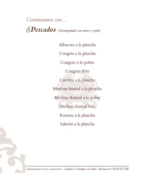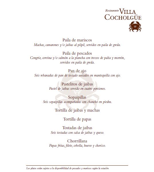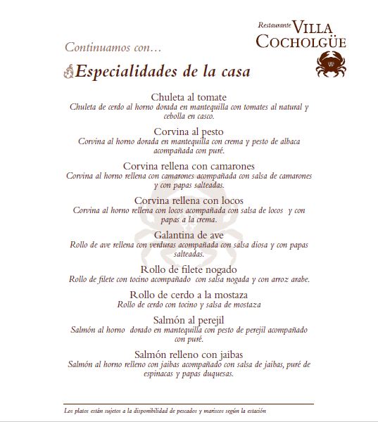 Entre los platos principales podrás encontrar pescados rellenos con camarones, jaibas o locos; chupe de locos; pastel de jaibas; machas a la parmesana y el reconocido rollo de filete con tocino y salsa nogada. Para garantizar los sabores y la frescura, nuestras preparaciones están sujetas a la disponibilidad de pescados y mariscos según la estación.