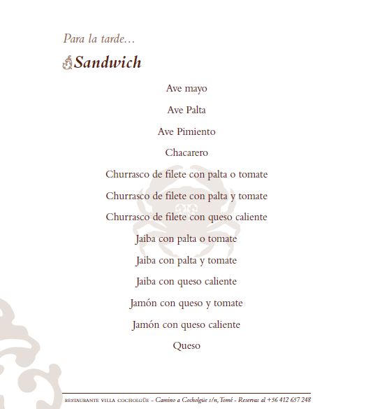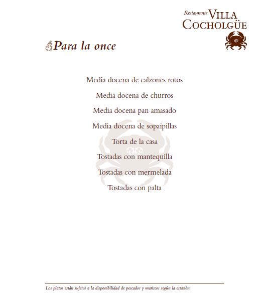 Para la once contamos con una exquisita variedad de sándwich en pan amasado, churros, calzones rotos, sopaipillas y nuestras inolvidables tortas de la casa.